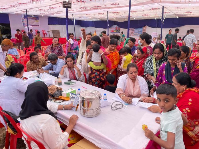 A free health and eye care medical camp was organized at Uttar Kattoli in the port city as part of the 23rd Universal Grand Religious Assembly and the round-the-clock Mahanam Sankirtan marking the Doljatra of Bhagavan Sri Krishna. A total of 630 people, including followers of Hindu, Muslim, and Buddhist communities, received eye care and general medical services at the camp.The day-long camp was arranged on Monday at the Uttar Kattoli Sebakhola Temple premises under the initiative of the Sri Sri Sebakhola and Baikunthadham Festival Celebration Council. Free health checkups, eye treatment, and necessary medicines were provided to the patients.Medical support was provided by Lions Charitable Eye Hospital and the Bangladesh Red Crescent Society. Medicines were supplied with the support of Albion Laboratories Limited.Among the guests present was Biplab De, Executive General Secretary of the Central Committee of Sri Sri Janmashtami Celebration Council Bangladesh. He said, “Such humanitarian initiatives centered around religious festivals set examples of harmony and compassion in society. Standing beside the helpless and underprivileged is true service.” He welcomed the initiative and urged the organizers to continue such activities in the future.Special guest Shamsul Alam, former Ward-level General Secretary of the Bangladesh Nationalist Party (BNP), said, “Religious organizations play a significant role in public welfare. Healthcare is a basic human necessity, and such free medical camps provide great support to ordinary people.”Others present included Dr. Shabana Sultana, Deputy Director of Lions Charitable Eye Hospital; Dr. Mukta Chowdhury, Senior Medical Officer of Chattogram Red Crescent Hospital; advisor Subodh Ranjan; along with other leaders.The event was presided over by Salil Sen, Convener of Sri Sri Sebakhola and Baikunthadham. Anton Das, Iqbal, Jewel Shil, Biraj Moni Acharyya, and Ashish Das also spoke at the program. The organizers expressed gratitude to the guests, physicians, and supporting organizations at the conclusion of the event.
